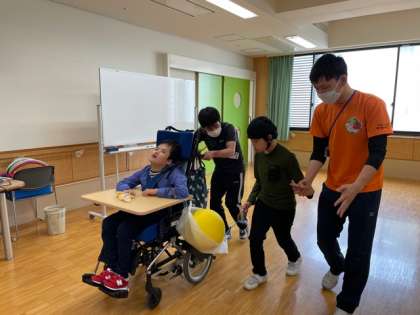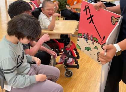 梅雨入りとのことで,「雨」に関連した本の読み聞かせをしました。読みたい大型絵本を自分たちで選び,先生に読んでもらいました。盛り上がるところで「わあー!」と声をあげたり,プリンが出てきたところで「食べたいなー」と舌をぺろぺろしたりとたくさん気持ちを表現していました。後半は運動会メドレーに合わせてフラフープやソフトボールを協力して運ぶリレーをしました。音楽にあわせてノリノリで活動しました。
