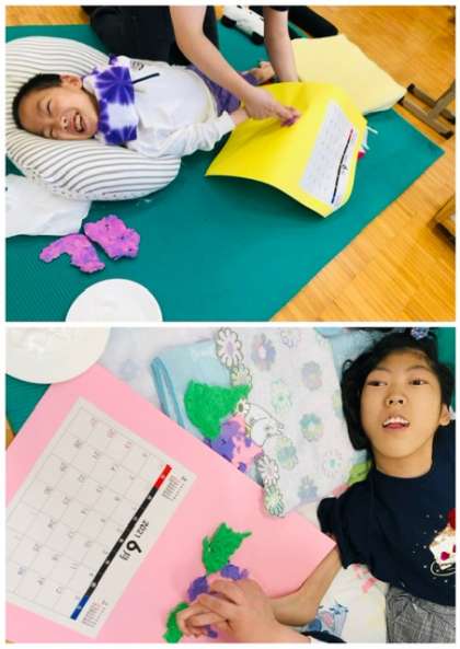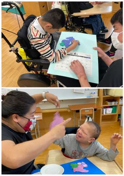 じめじめ雨の音を感じながら,「あじさい」をテーマにして6月のカレンダー作りをしました。ミキサーで作ったカラーパルプのでこぼこした感触や,ボンドのべたっとした感触を味わいながら制作をしました。