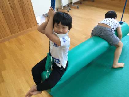 「D棟であそぼう!」の時間に,吊り遊具やサイバーホイール,エアトランポリンを使って活動しました。朝からワクワクしていた大好きなD棟での活動です。キラキラの笑顔でたくさん身体を動かしました。