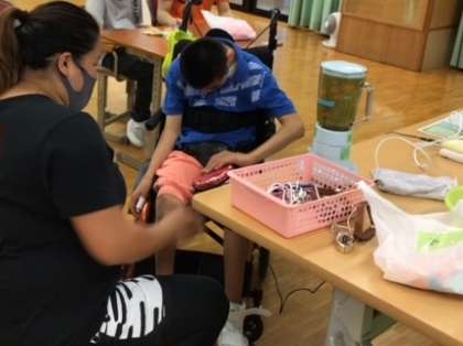 地域との交流ユニットでは,画用紙とミキサーを使ってはがき作りをしています。色とりどりの画用紙を自分たちのやり方でちぎり,水と一緒にミキサーにかけました。画用紙の破れるビリビリという音や,スイッチを押したときのカチッという感触,ミキサーの動くモーター音,どろどろになったパルプのひんやりした感触をたっぷりあじわいました。はがき型に成形したパルプを見て「いちごシェイクみたいだね」「淡くてきれいな緑色になったね」とそれぞれの作ったはがきの色を鑑賞しました。