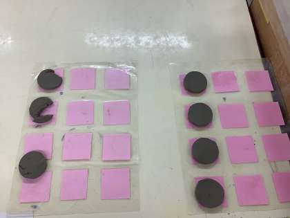 マグネット製作の様子です。形が崩れないように作る目標に向かって丁寧に製作しました。自分で見本の形と同じようにできたものと欠けたり線がついたりしているものを見分けて,別のシートにのせました。