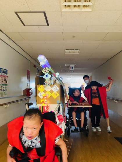 地域との交流ユニットでは,「祇園祭」をテーマにして,山鉾巡行をしました。みんなで作った飾りをたくさん山車に貼って,イルミネーションを鉾に見立てて,はっぴを着て,準備は万端!お囃子のメロディーとともに学校中を練り歩きました。むっとする梅雨明け前の空気も,本物の祇園祭のような雰囲気をかもし出していました。生徒たちは巡行した職員室や事務室,保健室で手作りの暑中見舞いを渡しました。お祭りの雰囲気が楽しくて,飛び切りの笑顔を見せたり,「早く行こう!」とばかりにぐんぐん前に進んだりして気持ちを表出していました。