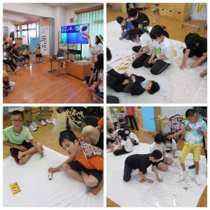 中学部1年生は,ダイナミックアートに挑戦しました。初日は,大きな布に『海』を表現するため『さかなクン』ならぬ『さかなチャン』と海の生き物について学習しました。2日目は,成逸小路でダイナミックに着色。氷絵具,水風船,水鉄砲,ペットボトルシャワーなど,それぞれ好きな方法で仕上げていきました。最後は完成した『海』を背景にして記念撮影。雨上がりの午後,みんなの笑顔がはじけました