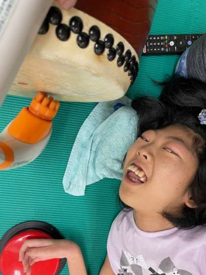 今日の-POPでは,「おぼろ月夜」「島唄」の手話をしました。「月」の手話をほとんどの生徒が覚えていて,何度も「月!月!」とアピールしたり,イルミネーションを見ながら「月や!」と手話で先生に教えたりしていました。「島唄」では「海」の手話を気に入って上手に手話歌を歌っていました。和太鼓を使ってリズムとメロディを感じる活動では,動画の見本をしっかり見ながら元気にリズムを叩いていました。スイッチを使ってマッサージ機を動かし,リズムを刻む生徒もいました。