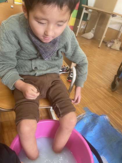 寒い日が続き,足湯がますます気持ちよくなる季節になりました。入浴剤を入れた良いにおいのお湯に足をつけると,ニッコリ!あまりに気持ちよくて,寝てしまいそうになる子や,「まだ終わりたくないよ〜。」とアピールする子もいました。週末にみんなでほっこりすることができました!