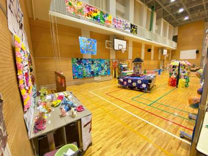 体育館の後方では児童生徒の作品を展示しています。
