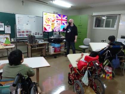 初めて分教室の児童生徒と学習するので,自己紹介をしていただきました。ライリー先生の自己紹介の中で,出身地のイギリスの紹介や趣味の話をしていただきました。イギリスの有名な食べ物の写真を見て,その写真を指さし,口に入れる仕草をする児童もいました。自己紹介の後は,『If you‛re happy and you know it』(幸せなら手を叩こう)と『Head Shoulders Knees And Toes』(あたま・かた・ひざ・つまさき)の2つの手遊びをライリー先生としました。ライリー先生と一緒に手遊びをして,児童生徒は笑顔になりました。次に『ハロウィンビンゴ』をしました。ビンゴカードにある秋の味覚,ハロウィングッズの英語を教えていただいたあと,ビンゴのスタートです。ビンゴは児童生徒が一人ずつブラックボックスの紐を引っ張り,出てきた写真カードと同じ物がビンゴ表にあれば,シールとそのものがもらえます。ビンゴの後は,ビンゴでもらった衣装を身に着けて,一緒にダンスも踊りました。新しいALTの先生との学習に初めはどきどきしていましたが,児童生徒たちは笑顔で一緒に活動することができました。