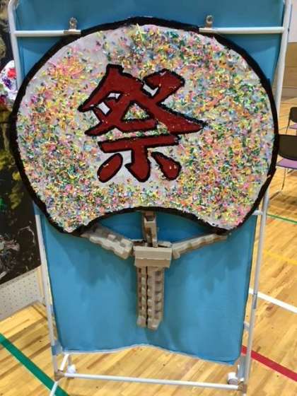 中学部では,ワークスタディ「創造・創作」ユニットと,総合的な学習の時間「地域との交流」ユニットで合同制作に取り組んできました。夏に学習した祇園祭の山鉾をグレードアップして,1mを超える巨大うちわと一緒に展示しました。山鉾や背景は,生徒たちがダイナミックアートをしたものを組み合わせています。巨大うちわは,スイッチを使ってシュレッダーを動かして作ったカラーパルプをたくさん貼って仕上げました。あきフェスに向けて一致団結し,素敵な作品ができました。