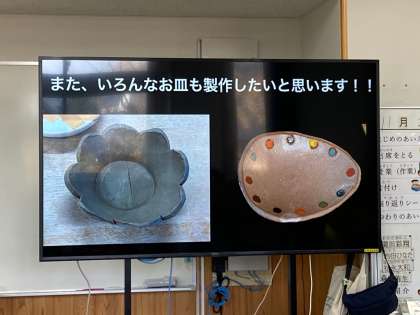 陶工グループでは,新しい製品づくりに取り組んでいます。今日は,西陣にある『カフェ・フロッシュ』さんからご注文いただいたお皿の製作に向けて,店長さんからのビデオメッセージをみんなで見ました。素敵な町屋のカフェ店内や,お皿にスイーツが盛り付けられている様子などを見て,みんな興味津々です!新しい製品づくりに向けて,「やるぞー!」と気合が入ります。