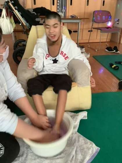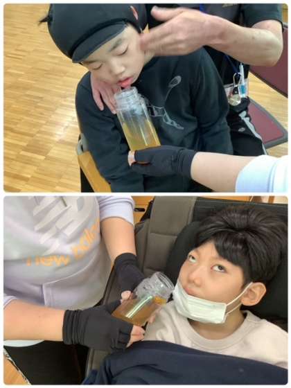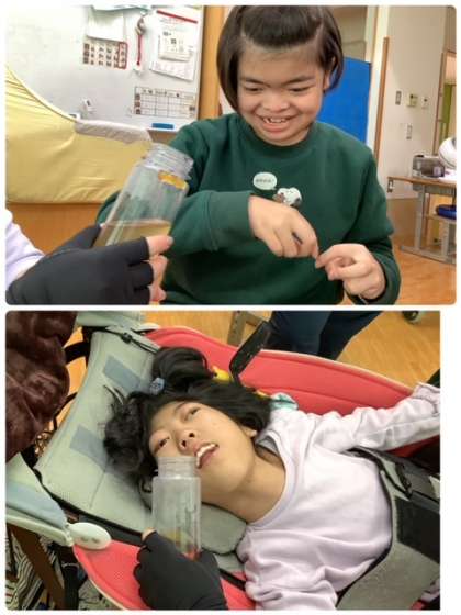 12月は「冬」をテーマに活動しています。冬においしい飲み物・食べ物シリーズで嗅覚を刺激しています。今日は「ゆず茶」「しょうが紅茶」「うどんスープ」のにおいを感じました。「ゆず茶」の甘く,爽やかな香りを気に入った生徒が多く,ボトルを持とうとしたり,口元に持っていこうとしたり,ついついじゅるりと口に唾が集まったりする姿が見られました。今日はぽかぽかお天気で教室内も暖かかったので,ぬるめのお湯で足湯やホットタオルを楽しみました。