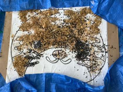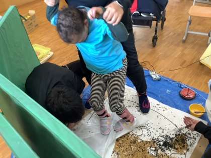 オブジェ作りでは,スイッチにサーキュレータやドライヤーを繋ぎ,風の力でパルプやイチョウの葉を飛ばして台紙に貼りつける活動をしました。パルプを定着させるために足踏みする係や,スイッチで掃除機を動かして掃除をする係など,役割分担をして活動しています。完成まであと少しです!