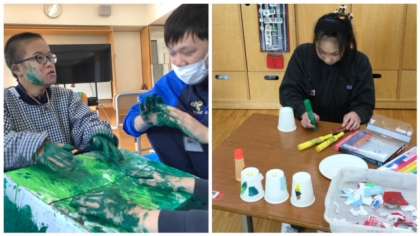 きたきたアートと北のアトリエでは,季節の飾り「ボックスツリー」を共同制作してきました。きたきたアートはダイナミックな動きで,全身を使ってアートに取り組んでいます。段ボール一面に緑や黄緑,白などで着色しました。北のアトリエでは,紙皿や紙コップ,プラコップを使ってオーナメントを作りました。赤や白がツリーのアクセントになっていて,緑に映える仕上がりになりました。