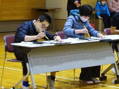 まずは高等部1年生の出し物によるオープニングです。代表生徒が今年の目標の書き初めをしました。