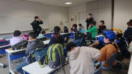 出発式です。まず,教頭先生のあいさつを頂きました。その後,行き先が忍者達のいる場所ということで,「ニン ニン オー!」のかけ声で部屋を出発しました。