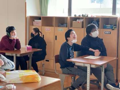忍者ショーを再度上映すると,昨日の興奮がよみがえってきました。「行けー!」と応援したり,忍者を発見してキツネポーズをしたり,大笑いしたりして楽しみました。お土産をもらって嬉しそうな生徒もいました。