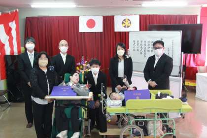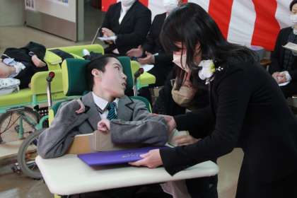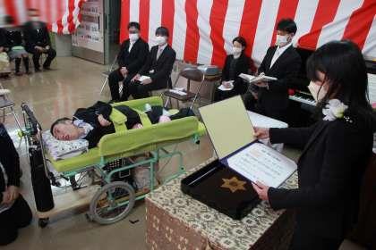 3月4日(金)午後から、紅梅分教室で第18回高等部卒業証書授与式が挙行され,2名の生徒が無事卒業しました。ご家族や病棟の方々が見守る中、自分のできる方法で返事をし,校長先生から卒業証書を受け取ることができ,緊張しながらも,笑顔で最後まで参加することができました。卒業しても様々な人と関わりながら,笑顔をいっぱいで過ごしてください。卒業おめでとうございます。