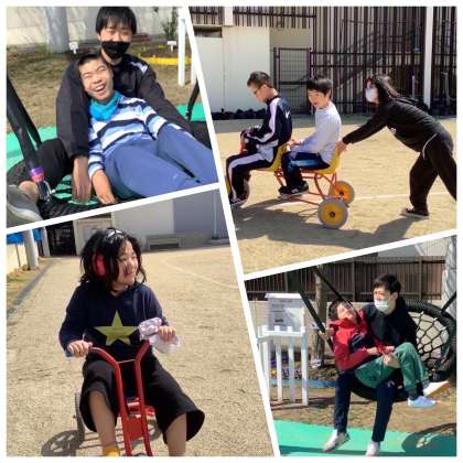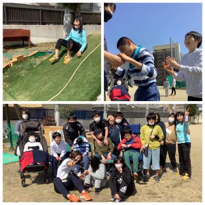 春を感じる気持ちの良い日に「成逸かがやき広場」へ行ってきました!バスケットブランコ,ボール,三輪車などがありましたが,それぞれ使ってみたいものは決まっていたようで,好きなものを選んで意欲的に身体を動かしていました。中学部1年として,学年みんなでグラウンドに来られるのは今日が最後でしたが,楽しいひと時になりました。