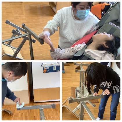 卒業まで後3日。感謝の気持ちを込めてこれまで使っていた机や椅子をきれいにしました。机や椅子を裏返してほこりをとったり,スポンジで磨いたりしました。床に落ちたほこりもフローリングワイパーを使って,全員で息を合わせて掃除しました。きれいになった机や椅子を見て,「がんばった!」と笑顔を見せたり,「もっとやりたかったよ〜」と意欲を見せたりしている生徒もいました。
