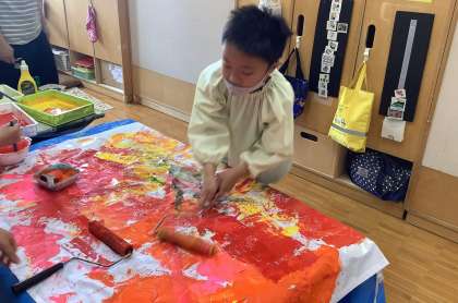 絵の具を使ってあおぞらスポーツフェスタ2022の学年旗を作りました。筆やローラーなどの道具を使ったり,手を使ったりして思い思いに色を塗りました。完成が楽しみです!!