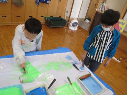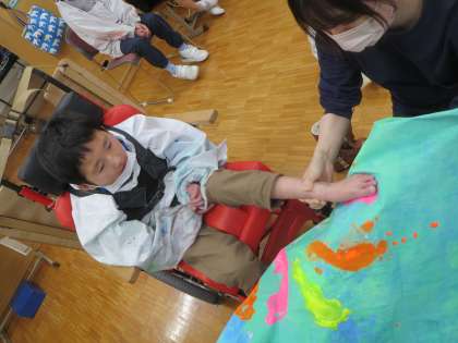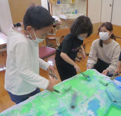 ローラーや筆,自分の手も使って,隙間なく端まできれいに色をつけることができました。そして仕上げに3年生全員の足形をつけて完成です。とっても素敵な学年旗ができました!