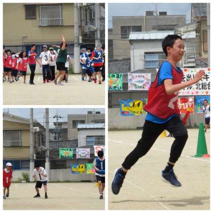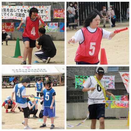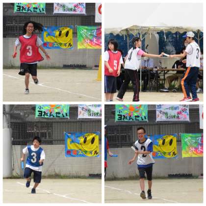 サンバのリズムにのって,笑顔で入場したリレーメンバー。縦割りチームの対抗戦ということで,学年を超えてバトンをパスします。熱い戦いに大盛り上がりでしたね。