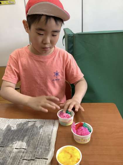 画用紙に絵を描いたり,花紙を丸めてお花をつくったりして,素敵な花束ができました。完成した花束は,『ありがとう』の気持ちを込めてお家の人にプレゼントしました♪