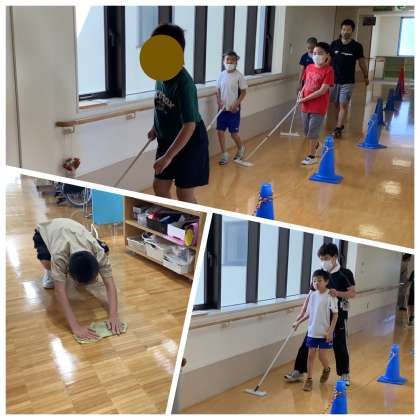 月に一度の大掃除「クリーンデイ」でした。「ランニング」や「身体の学習」の時間に行うということもあり、校内ウォーキング形式で長い廊下を歩きながら掃除をする学年もありました。立位台やウォーカーを使って身体を動かす人、雑巾がけで汗を流す人、それぞれ頑張る様子が見られました。