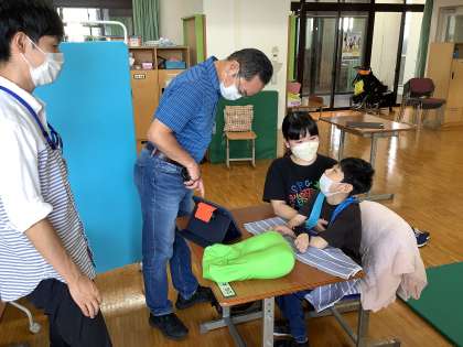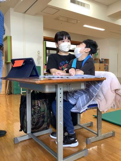 「身体の学習」の様子を、PT(理学療法士)の先生が見にこられました。毎日取り組んでいる座位。その安定した姿を褒めていただき、生徒も指導者も励みになりました。