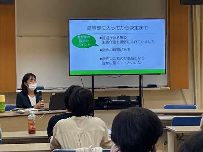 10月6日(木)、卒業生の保護者の方2名にご来校いただき、進路選択にかかわるお話をしていただきました。お子さんの様子や事業所の対応など、「就労までの道のり」を詳しくお話しいただき、参加した皆様にとって有意義な学びの場、情報交換の場になりました。