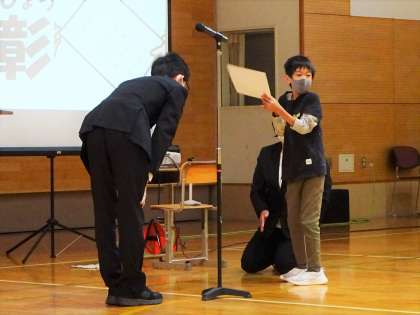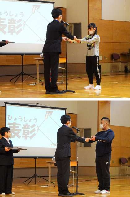 始業式の後の表彰式の様子です。「姉妹都市交歓作品展」に出品された児童生徒のうち、各学部代表1名が、校長先生から表彰状を受け取りました。