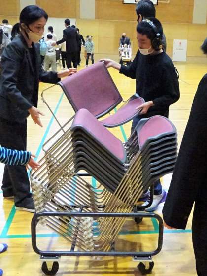 終了後は、終業式同様、体育館で参加した小学部児童みんなで会場の片付けをしました。促しを受けたり、周りの状況を見たりして動けていて、素敵でした。