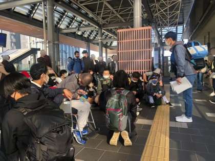 高等部2年生は今日から2泊3日で修学旅行に行きます。まずは京都駅で出発式です。天気も大変恵まれて、元気いっぱいに、行ってきます!