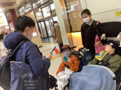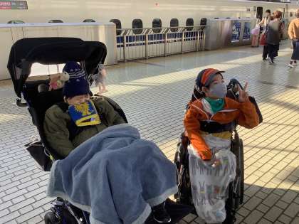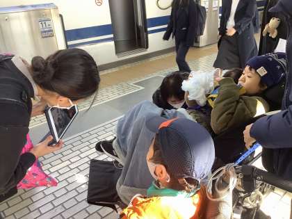校長先生や友達からの「行ってらっしゃい」のメッセージを見たり、リモートで朝の会も一緒に行ったりしました。これから新幹線に乗って神戸へ向かいます。