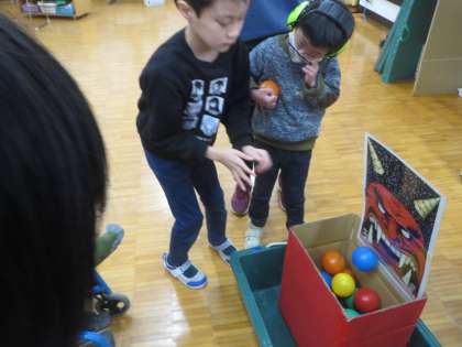 「節分」を前に、豆を撒く、年の数だけ豆を食べる、黙って恵方巻を食べるなど、様々な風習があることを知る学習をしました。その後、それらの風習に触れようとダンスや豆撒き、恵方巻リレー、クイズをしていると…鬼の登場です。怖がりながらも、鬼さんに「頑張ります!」と決意表明をしながら握手をする子どもたちでした。