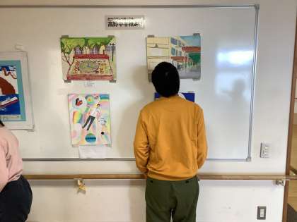 居住地校交流として,地域の中学校と作品交流を行いました。高野中学校と修学院中学校の生徒の作品を観ながら,「知っている人いるかな」と話している姿がありました。