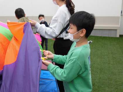 「ワンダフォー・しゅうかい」の時間にダンスをしました。他にもみんなでパラバルーンをしました。パラバルーンの中に入って上下する動きを見たり、先生と一緒にパラバルーンを動かしたり、思い思い楽しんでいました。
