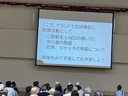 上京区長様をはじめとしたご挨拶のあと、救援活動として心肺蘇生とAEDの使い方、消火器の取扱、把架、ジャッキの取扱について動画を交えた講習の後、運動場にて実地訓練が行われました。