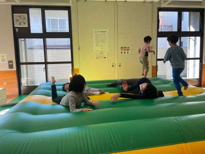 プレイエリアと重度体育室では、ふかふかのブロックの上を何度も行き来したり、学校よりも大きいエアトランポリンの上を何度も跳びはねたりして、思いっきり身体を動かし、沢山の笑顔が見られました!