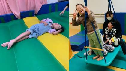 5年生は午前中はプレイエリアに行き、エアトランポリンや吊り遊具などでたくさん体を動かして遊びました。トランポリンでは元気に飛び跳ねたり、寝転がってリラックスしたりするなど、思い思いに楽しみました。
