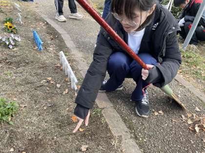 雪が散る中、高等部の合同ワークでせせらぎ公園のメンテナンスをしました。厳しい寒さが続いている中でもキレイにお花が咲いていました。年末に芽を出したチューリップもしっかり伸びていました。春が待ち遠しいです☆