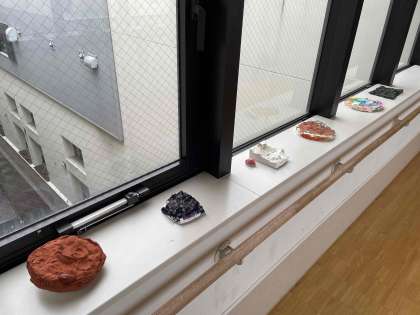 総合芸術で「令和の化石」を作りました。石膏を使って、個性豊かな形や色の化石ができました。5階の渡り廊下に展示しています。また見にきてください!