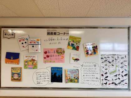 校内の掲示板に「図書館コーナー」があります。今回は新しい本の紹介です。みなさんも図書館に本を見にきてくださいね☆