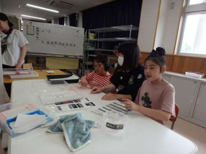 中学部のワークスタディ「手工芸」では教職員用のリサイクルメモ用紙を作ったり、リサイクル用として裏面を使用するためにハンコを押したりする作業に取り組んでします