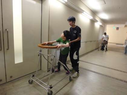 昨日に引き続き、中学部2時間目の様子をお伝えします。今日は身体の学習です。指導者の働きかけをうけて身体の緊張をほぐしたり、ウォーカーや立位台に取り組んだりしています。
