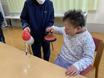 役割・創作班と環境メンテナンス班がランチルームを清掃しました。霧吹きのスイッチを押して机に水をかけ、台拭きで拭きとりました。生徒同士が協力し、助け合う姿を見ることができました♪