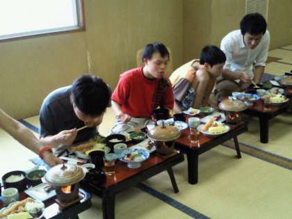 A班は夕食の時間です。今日の話をしながら、モリモリおいしく食べています。宴会のようでとても楽しそうですね。