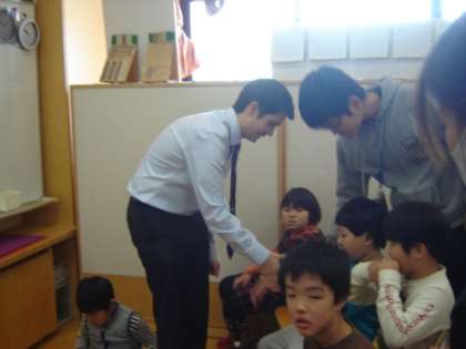 今日(10月28日)から1週間ALTのマックス・クラーク(Maxx・Clark)先生が英語を教えに来てくれました。今日の最初の授業は、小学部の中学年のこども達でした。マックス先生と一緒に「ロンドン橋落ちた」を一緒に歌いながら、みんなで円になってゲームをしました。子どもたちにとても親切なマックス先生の授業を、みんなとても楽しんでいました。これから1週間さまざまな学部で、工夫した英語の授業を行ってくれます。