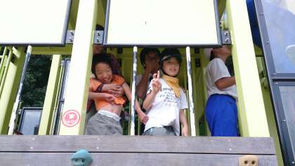 スムーズに予定がすすんでいます。無事宿泊地である「しあわせの村」に到着し,トリム園で遊具遊びをしています。