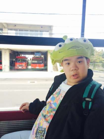 シャトルバスに乗って,ディズニーランドに移動中です。
