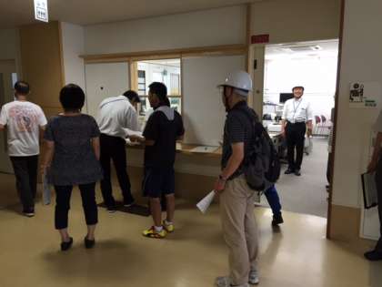 C棟の生活学習室での火災ということで,はじめにA棟のエレベーター前に一時避難をしました。各階のフロア長が人員の確認を行い,本部が置かれた事務室前に報告に来ます。全員の避難が確認されたあと,次に火災が延焼しているという設定で,運動場西側へ二次避難を行いました。非常階段等を使って移動しました。